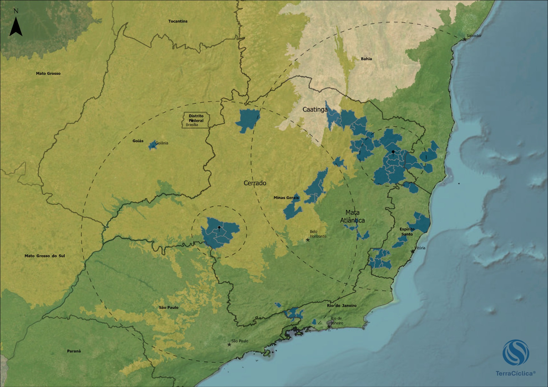 Suporte realizado em mais de 60 municípios distribuídos entre Minas Gerais, Espírito Santo, Bahia, Rio de Janeiro, São Paulo e Goiás.